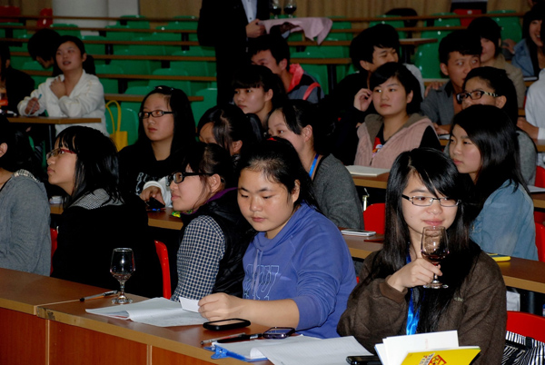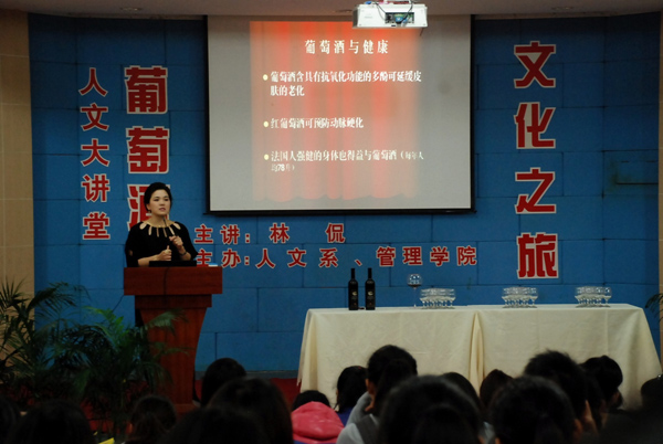主讲的林侃老师曾赴澳大利亚、法国等多个国家留学及学习葡萄酒品鉴的专业知识,有深厚的相关文化知识。林侃老师以生动语言,图文并茂地向同学门介绍了葡萄酒文化及葡萄酒品鉴知识,包括葡萄酒的起源和历史、文化,葡萄酒的分类、影响葡萄酒风味的因素、品酒步骤,世界五大名庄及葡萄酒饮用礼仪常识等;同时,还向同学们介绍了相关各国的风土人情及自然风光。讲座最后还进行了葡萄酒知识问答,同学们踊跃参加,回答问题并品尝了事先准备好的葡萄美酒,现场气氛十分融洽,讲座受到同学们的热烈欢迎。