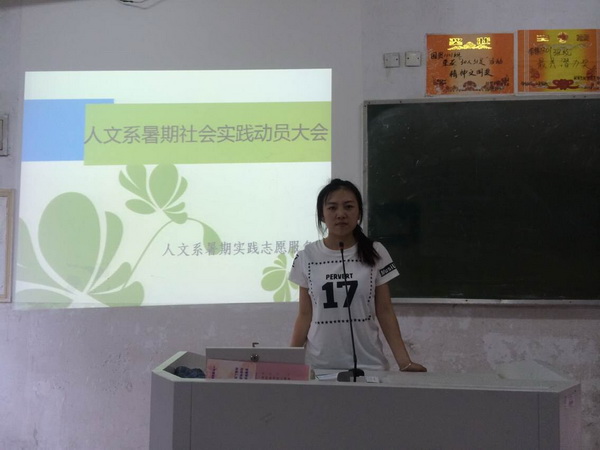 6月18日下午,人文系举行了暑期社会实践动员大会,人文系今年组织了两支实践服务队伍,分别是赴永嘉县鹤盛镇岭头村“关注民情、改善民生、心系新农村建设”志愿服务队和赴泰顺县罗阳镇仙稔村“文化旅游、美丽温州”志愿服务队。人文系党总支副书记徐辉老师,辅导员尤裕老师和27名暑期实践队员参加了此次会议。