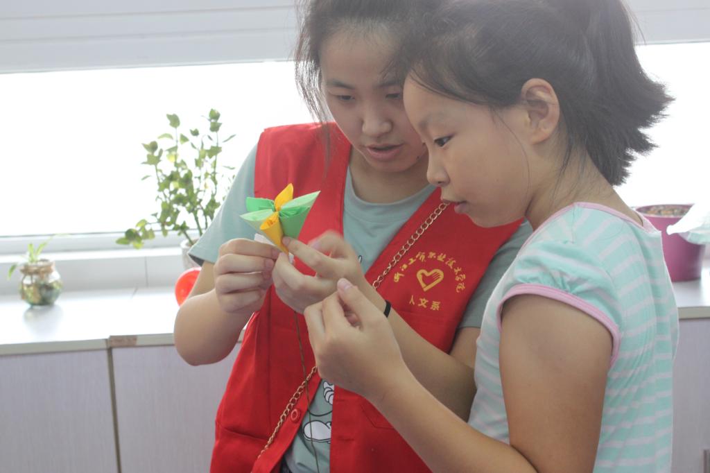 活动中,志愿者们以小组形式,将班级员工分成4人一组,每组由1位志愿者负责指导,志愿者们用自己带来的材料,耐心细致地向小员工们描述折纸花的方法,展示折纸花的步骤。遇到稍难的地方,志愿者们都会放慢节奏,重复演示,让每一个小员工都能一一领会。随后,是小员工们自己尝试了,他们有的东张西望、尽力回忆,有的努力尝试、大胆摸索,志愿者们都能耐心讲解,将困难一一化解。当一朵朵美丽的纸花从小员工们手中绽放的时候,小员工们欣喜若狂,志愿者们也无比欣慰。最后,由小员工们自己创作,他们纷纷开动脑筋,发挥想象,将内心世界和此刻心情用折纸一一呈现。志愿者们付出一份耐心,收获的是小员工们一份份天真和信任。