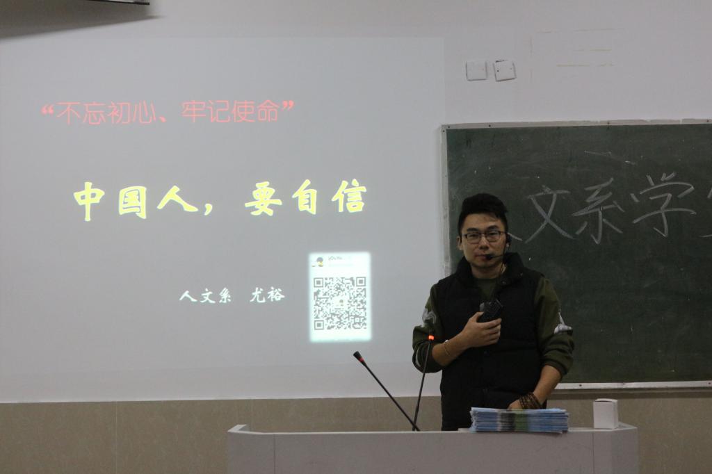 第二个阶段是由尤裕老师进行《中国人,要自信》的讲话,尤老师从中国的制造、科技、文化、孝道、礼仪与品德等方面分析了中国的愈发强大,他强调了文化复兴的重要性,肯定了中华民族伟大的复兴目标的实现。最后,尤裕老师希望身为中国人的我们要自信,中国在崛起,身为中国人的我们要更加自信!没有高度的文化自信,没有文化繁荣兴盛,就没有中华民族的伟大复兴!