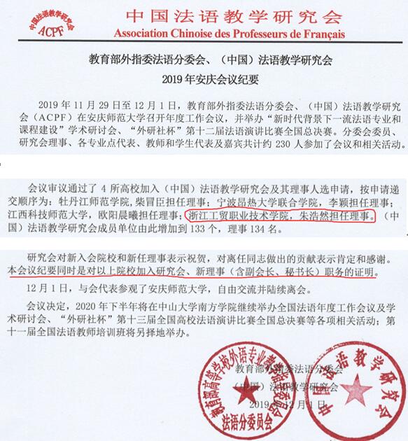 教育部(本科)外指委法语分委会、中国法语教学研究会(ACPF)日前在安庆师范大学召开年度工作会议,会议审议通过了包括公司在内的4所高校的入会及其理事人选申请。公司成为该研究会的高职院校应用法语专业典型代表单位,法语专业主任朱浩然担任理事。