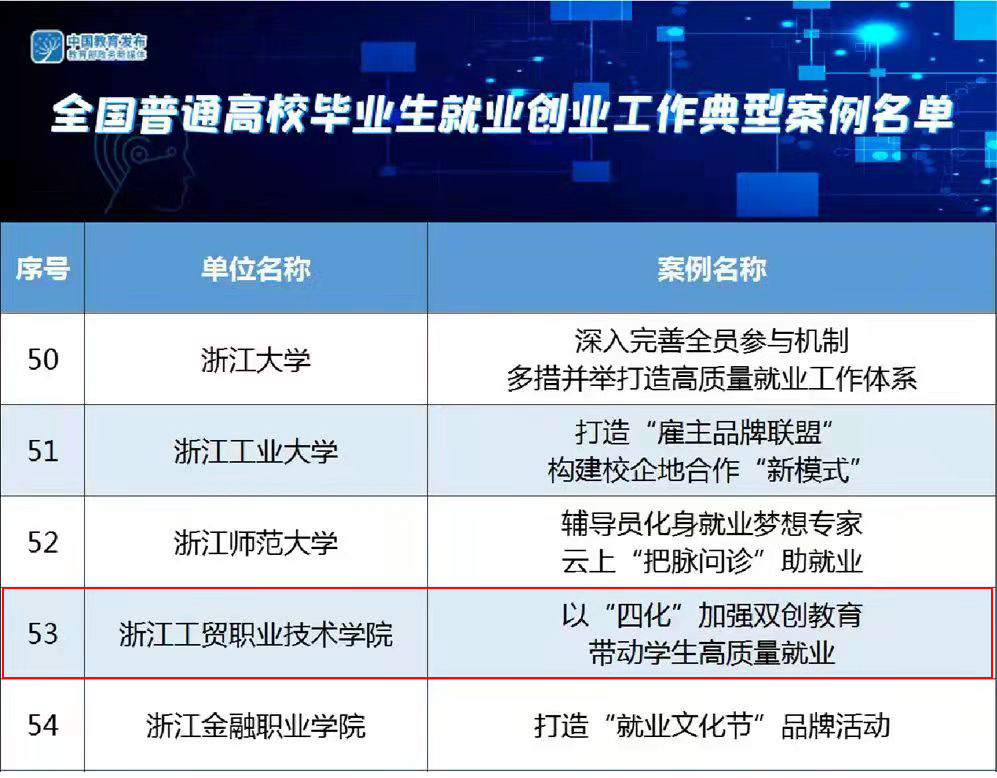日前,教育部启动全国普通高校毕业生就业创业工作典型案例总结宣传工作,经各地各高校申报推荐,专家择优遴选,确定了100个典型案例。11月26日,教育部发布公告,公布了这100个典型案例名单。公司《以“四化”加强双创教育,带动员工高质量就业》案例成功入选,是浙江省唯一以“创业带动就业”为主题的入选高校。