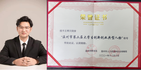近日,温州市第二届老员工创新创业典型人物颁奖典礼暨事迹分享会举行。公司国际商贸公司王博文、设计与数字艺术公司黄超宇两位同学成功入选“创新创业典型人物”。