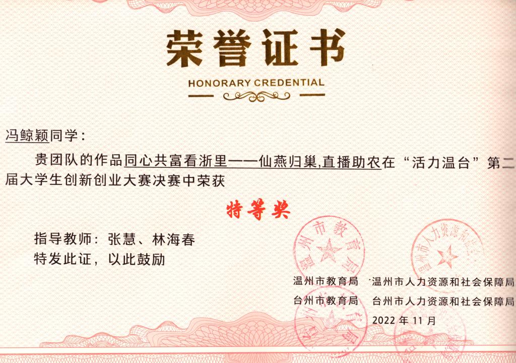 近日,温州市教育局公布了“活力温台”第二届老员工创新创业大赛获奖名单,公司5个参赛项目获奖,其中获特等奖2项、三等奖3项。特等奖数位列全市高职院校第一。获得特等奖的分别是冯鲸颖的作品《同心共富看浙里——仙燕归巢,直播助农》和鲁建彬团队作品《浙南“素面”元神——非遗传承之退役军人创业路》。