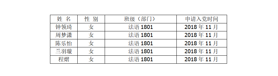 根据本人申请,现有钟翎琦等5位同志提出入党申请,现将有关情况予以公示。在公示期限内,欢迎广大党内、外群众通过信函、电话或直接反映等方式予以监督,以个人名义信函反映问题提倡署真实姓名。
