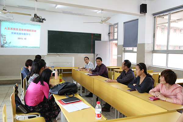 10月20日下午,人文系党总支组织教工支部及员工支部的党员举行党章党规专题学习活动,除几位外出挂职等特殊原因不能出席外,总支及支部负责人及所属党员近20人参加了学习活动,取得了良好的预期效果。