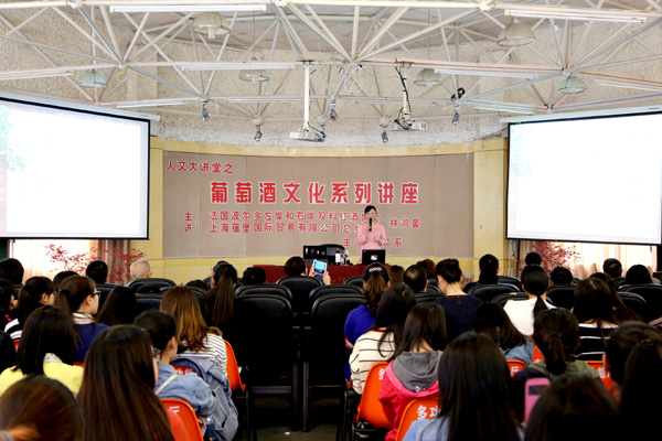 “钻石酒荟”品牌创始人林鸿晏女士。林女士从12岁起就接触法国文化,2005年起开始学习葡萄酒文化及相关鉴赏知识,先后通过了法国波尔多左岸和右岸红酒鉴赏师考评,成为“双料”红酒博士。据介绍,“红酒博士”不仅需要接受最专业的葡萄酒知识考核,通过近乎苛刻的层层测评,更要为重量级庄主所欣赏并引荐,才能获得葡萄酒王国的最高认证,考验的不仅是一个人的专业专注、执着和意志,更考验了一个人钻研和社交的全面能力。在本次的主题为“新世界与旧世界葡萄酒”讲座中,林鸿晏女士以生动语言及实物,图文并茂地向同学门介绍了葡萄酒的起源和历史、文化,葡萄酒的分类、影响葡萄酒风味的因素等知识。人文系主任尹清杰代表公司特聘林鸿晏为人文系客座教授,并颁发了聘书。