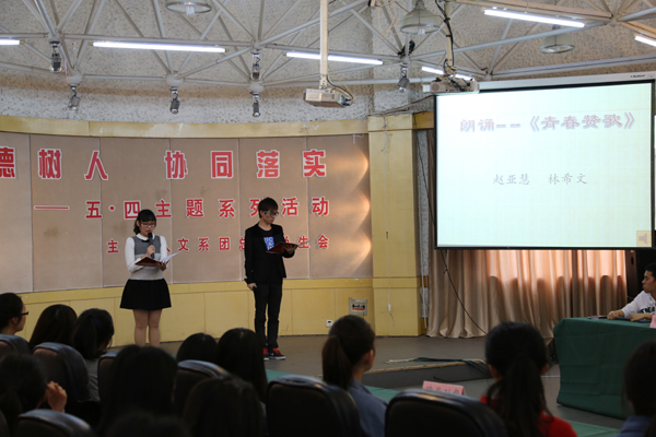 本次活动分为四个阶段进行。首先徐辉老师在致词中阐述了“五四”运动的历史意义及对中国社会发展变革带来的影响。随后播映了“五四”运动回顾系列视频;在热烈的掌声后,人文系的入党积极分子代表纷纷发言,分别从是“五四”的历程、“五四”的影响以及如何弘扬“五四”精神三个方面表达了继承发扬“五四”精神的体会感想。在随后阶段,同学们欣赏了精彩的青春诗歌朗诵、幽默讽刺小品和法语歌曲合唱,并进行了“五四”常识与公司发展相关知识竞答,令全场气氛达到高潮。最后系部还对奖学金获得者进行了表彰颁奖。