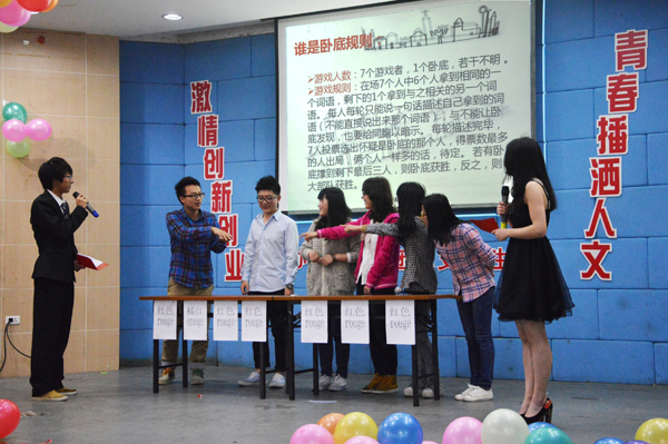 在主题活动中,无论是动感十足,展现了当代老员工的青春与活力的热舞,赢得笑声不断员工自己创新改编、幽默解读创新创业意识的小品《新武林外传》、《新白雪公主》,还是带领大家回味童真趣事的法语动画配音《美女与巫师》,以及同学们自编自演、展现法国风情的模特走秀《show time》等,都点燃了场内观众的热情、赢得掌声不断。在随后的互动环节,主持人通过《谁是卧底》的游戏教同学学习法语的单词:“cheveux” (头发),“table”(桌子)等,并为正确发音者发送精美小礼品,将现场气氛推向高潮。最后,法语1201班的全体同学合唱中法版《我的歌声里》圆满结束了此次活动。