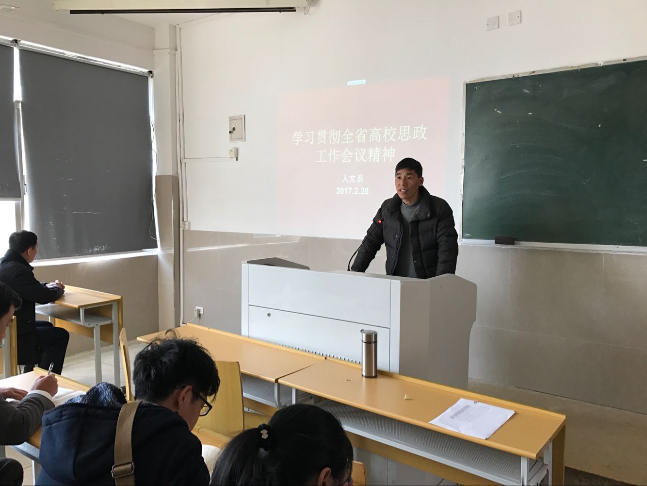 近日,全省高校思想政治工作会议在杭州召开。为了进一步学习贯彻习近平总书记系列重要讲话精神,强化立德树人的高校立身之本,2月28日下午,人文系召开全体教师集中学习贯彻全省高校思想政治工作会议精神的专题会议,会议由人文系党总支书记章纪顺主持。